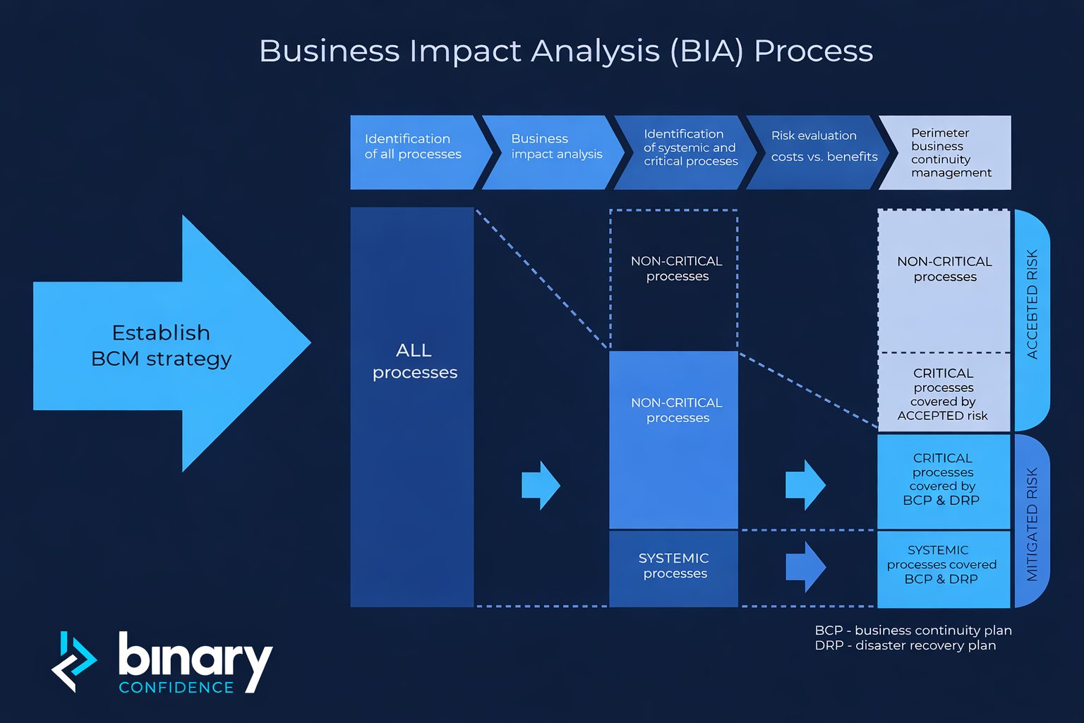 At Binary Confidence, when assessing a company, we take a top-down view of the business—not just its servers and applications, but its processes, people, and dependencies. The first step is always a Business Impact Analysis (BIA). Without it, a company simply doesn’t know what is truly critical.